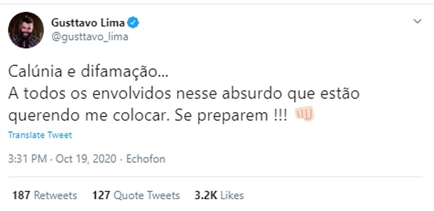 Logo após o áudio vazar, o músico postou em seu Twitter: “Calúnia e difamação… A todos os envolvidos nesse absurdo que estão querendo me colocar, se preparem!”.