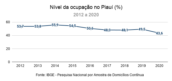 Em 2020, menos da metade (43,6%) das pessoas em idade de trabalhar tinham uma ocupação remunerada no Piauí. O dado é da Pesquisa Nacional por Amostra de Domicílios Contínua (PNAD Contínua), produzida pelo Instituto Brasileiro de Geografia e Estatística (IBGE). Esse percentual – denominado de nível da ocupação – foi o menor da série histórica da pesquisa, que iniciou em 2012.