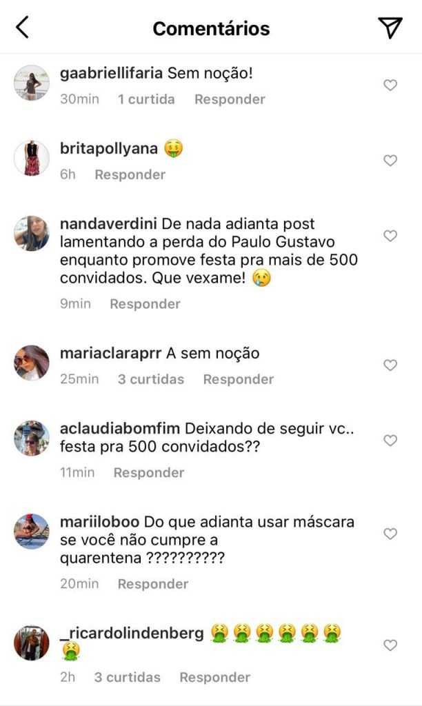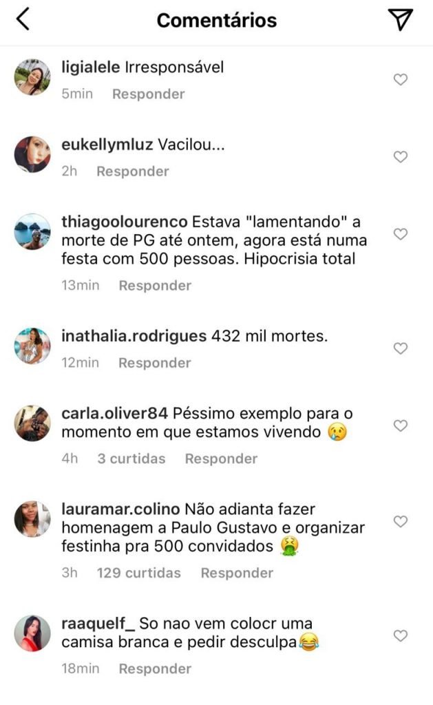 “De nada adianta post lamentando a morte de Paulo Gustavo enquanto promove festa para mais de 500 convidados”, escreveu uma usuária do InstagramReprodução/Instagram