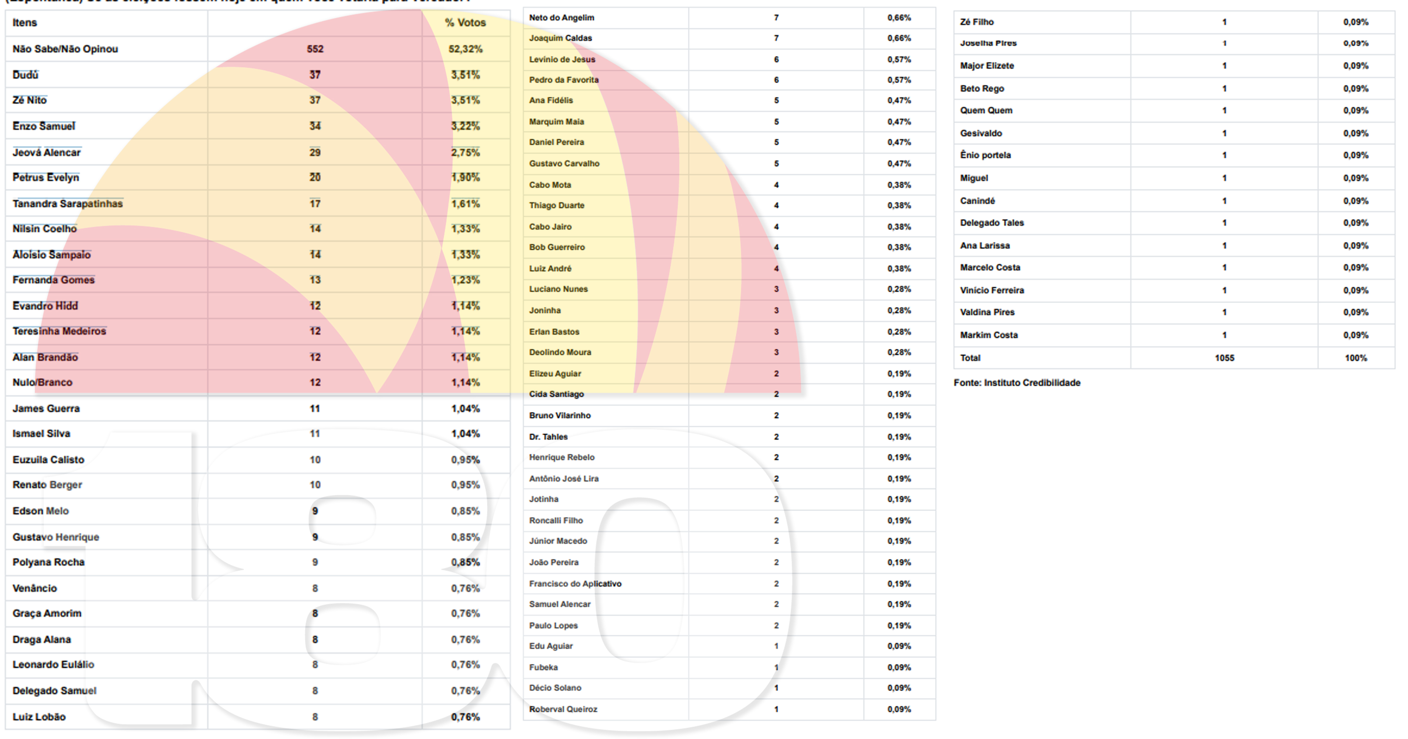 A pesquisa envolveu 1055 eleitores de Teresina, abrangendo zonas urbana e rural, com uma margem de erro de 3,03%. O número de registro da pesquisa é PI-03487/2024, consolidando-a como um indicativo relevante das preferências eleitorais na capital piauiense. Veja a lista completa abaixo:
