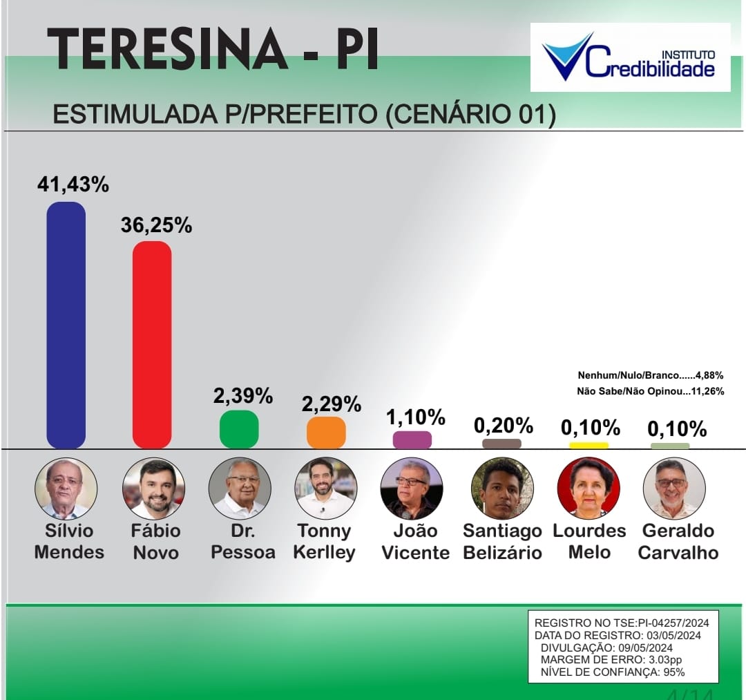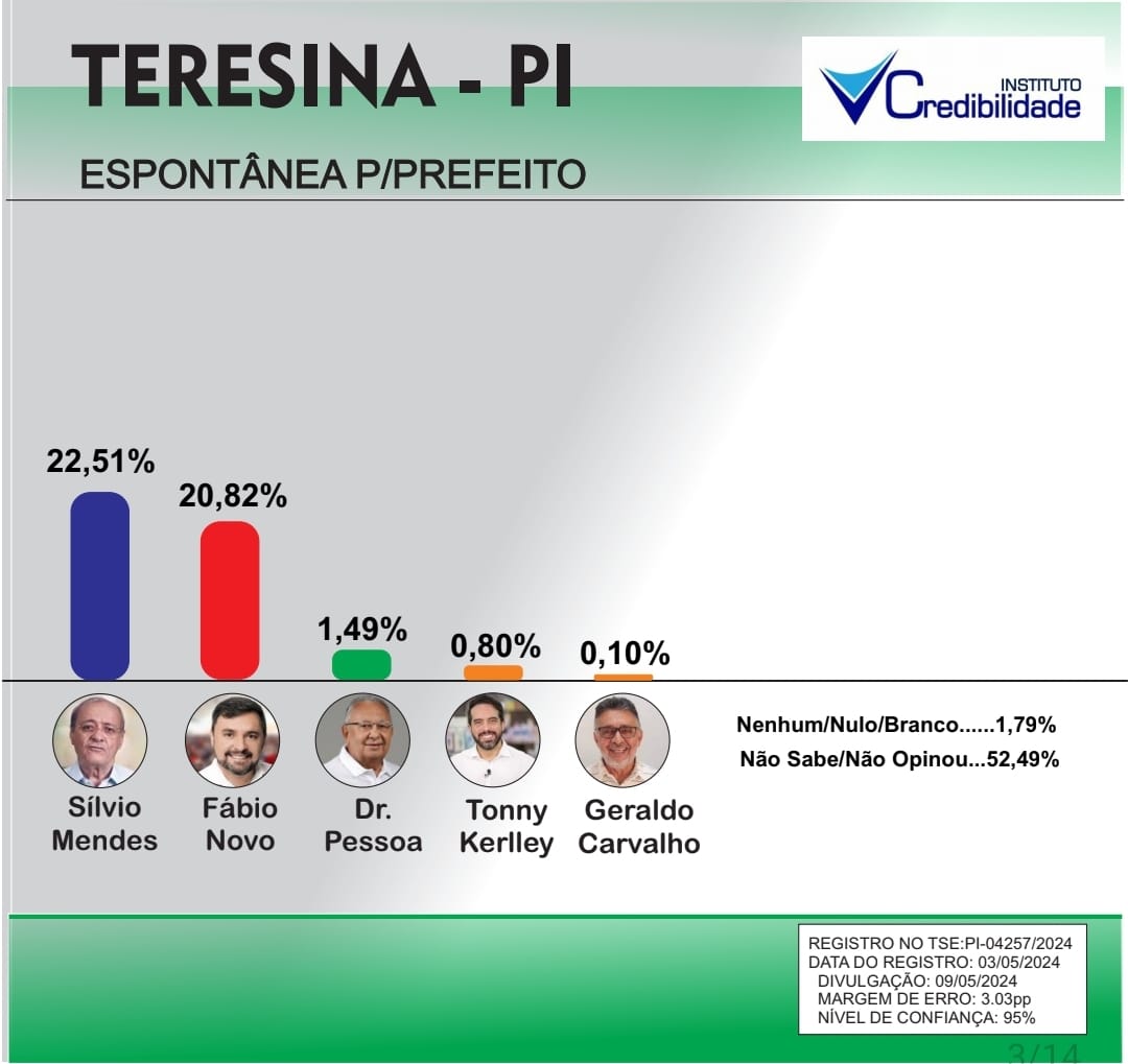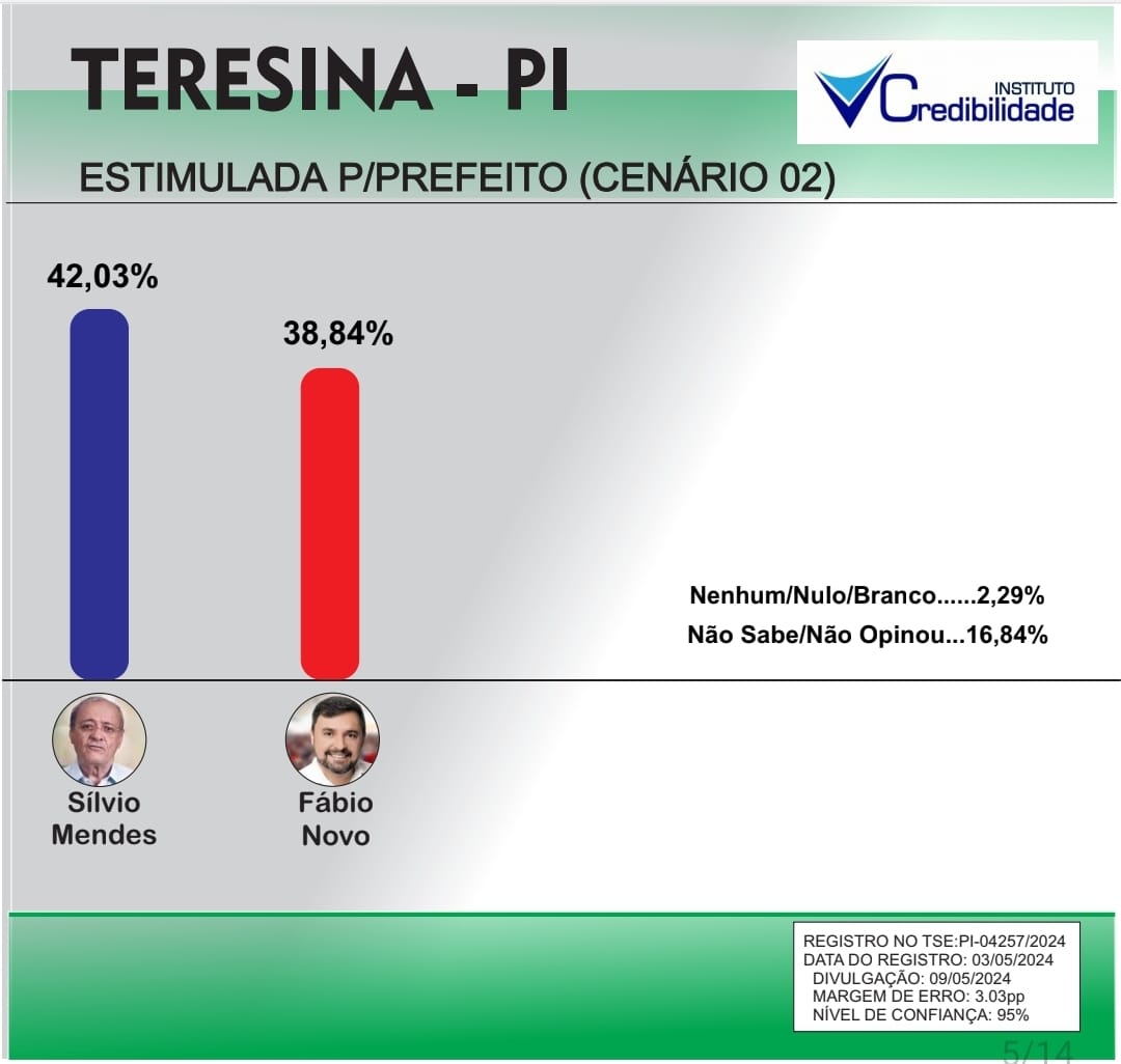 O Instituto Credibilidade divulgou nova pesquisa de intenção de votos para a prefeitura de Teresina. Quando se testa os nomes dos dois principais pré-candidatos, com os seus respectivos apoios políticos, em nível federal e estadual, Fábio Novo, com o apoio do presidente Lula e do governador Rafael Fonteles, tem 50,10%. Já Sílvio Mendes, com o apoio do ex-presidente Bolsonaro e do senador Ciro Nogueira, tem apenas 36,45%. Não Sabe/Não Opina é de 10,66%. Nenhum/Branco/Nulo, 2,79%.