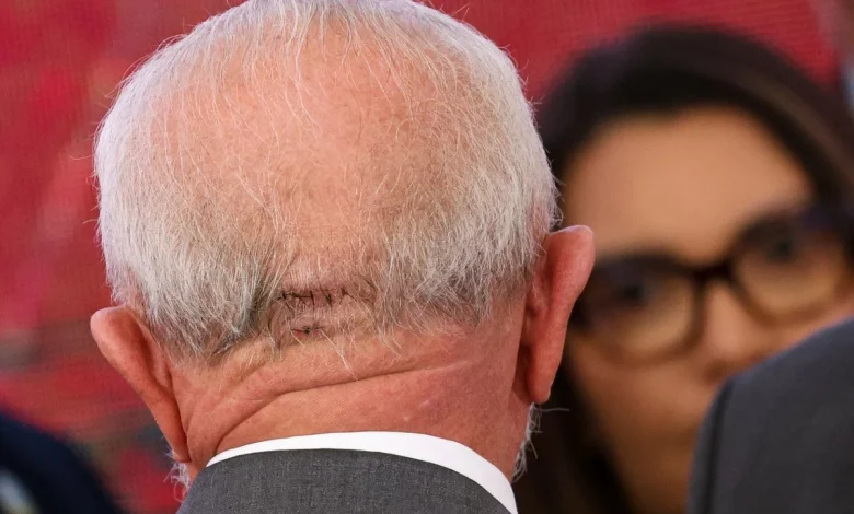 Com cicatriz na cabeça após sofrer um acidente doméstico, o presidente Luiz Inácio Lula da Silva participa de cerimônia no Palácio do Planalto, em Brasília, no dia 25 de outubro de 2024 — Foto: Ton Molina/Fotoarena/Estadão Conteúdo