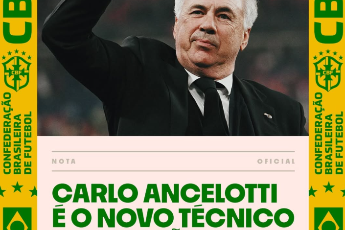 A Confederação Brasileira de Futebol (CBF) anunciou nesta segunda-feira, Carlo Ancelotti como novo técnico da seleção brasileira. O treinador italiano de 65 anos chega para a vaga de Dorival Júnior, demitido em março, com a missão de espantar a crise e dar confiança ao combinado nacional de olho na Copa do Mundo de 2026.